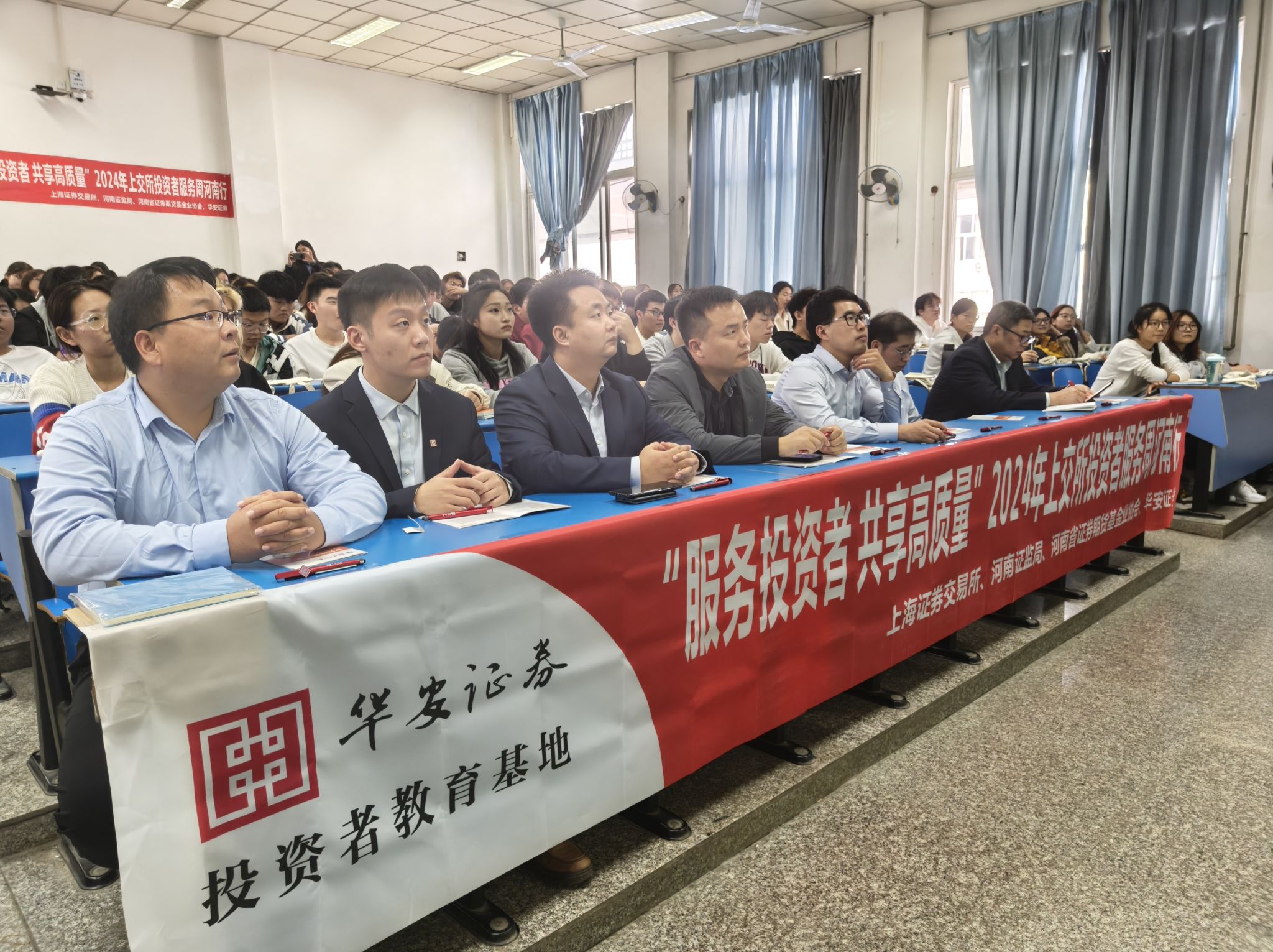 为深入贯彻落实党的二十届三中全会精神,提升高校学生金融素养,帮助学生了解金融市场前沿理论,掌握金融领域实务技能,助力职业发展规划。10月31日,上海证券交易所、河南省证券基金业协会、华安证券平顶山凌云路营业部走进yl23411永利集团官网登录,共同开展金融知识宣讲活动。上海证券交易所投资者服务部经理叶霄麒,河南省证券期货基金业协会综合部主任娄渊雷、华安证券平顶山凌云路营业部总经理任鑫鑫、yl23411永利集团官网登录领导班子,金融工程专业全体师生参加了本次活动。