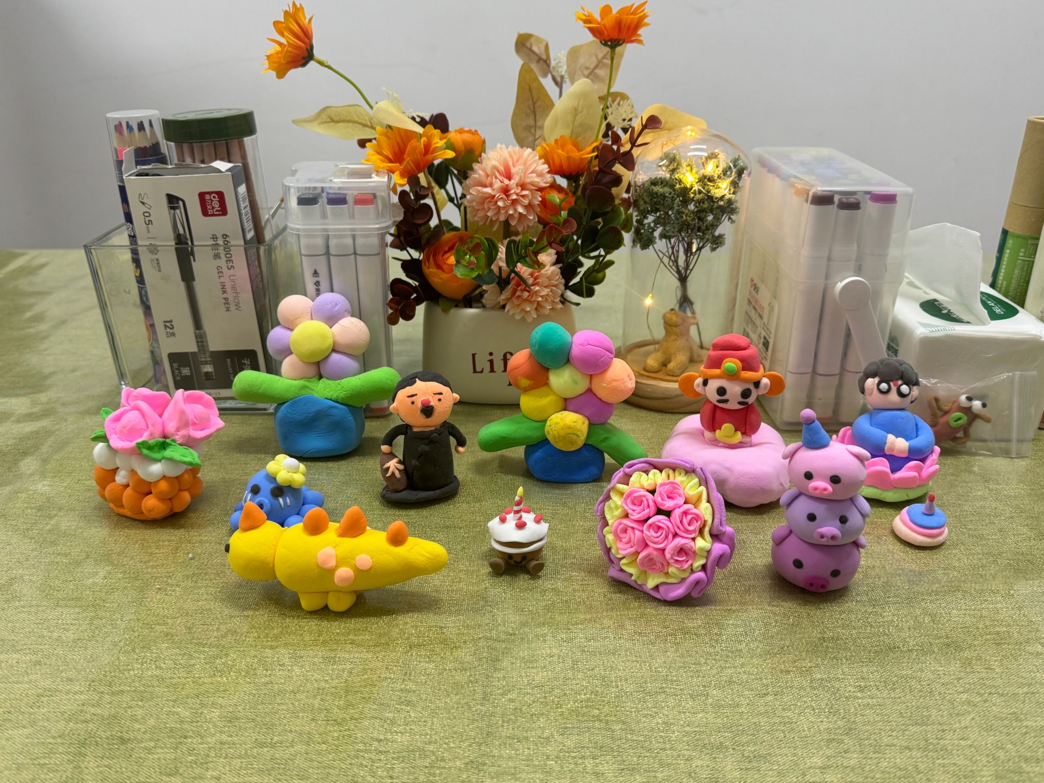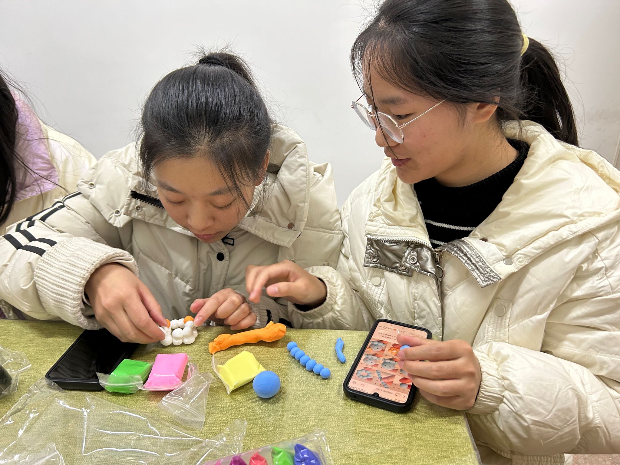 第二期活动为“黏土释放压力”,活动由自我介绍、制作粘土、分享交流三个环节构成。通过简短的自我介绍,大家相互认识形成良好的团体氛围。同学们纷纷拿起黏土,发挥自己的想象力,将手中的黏土塑造成一个个独具个性的作品,有憨态可掬的小动物、精致美丽的花朵、惟妙惟肖的人物等,在黏、挤、按、压的过程中释放压力、收获快乐。最后,通过分享自己的作品,相互交流想法。