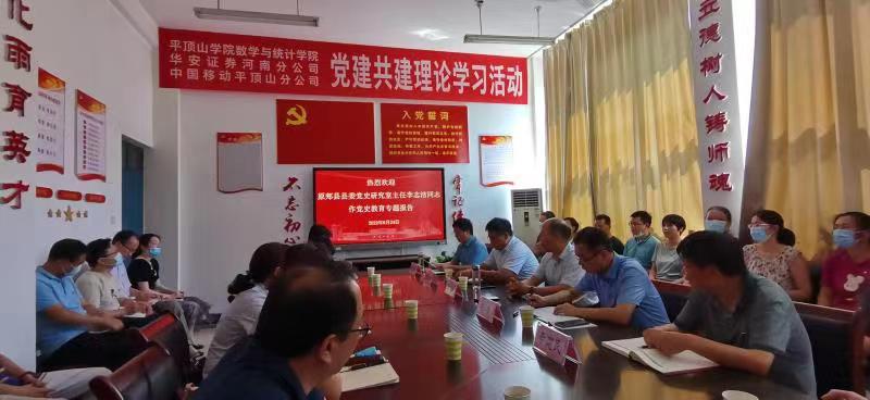 在即将迎来建党101周年之际,为扎实推进能力作风建设年学习教育活动,6月24日下午,yl23411永利集团官网登录党委与中国移动平顶山分公司、华安证券河南分公司平顶山凌云路营业部党支部开展党建共建“同上一堂党课”活动。此次活动邀请原郏县县委党史研究室主任李志洁作专题报告,yl23411永利集团官网登录党委书记张建林主持,中国移动平顶山分公司副总经理岳佳,华安证券河南分公司平顶山凌云路营业部副总经理尹剑锋,数统院领导班子,以及双方的40多名党员参加活动。