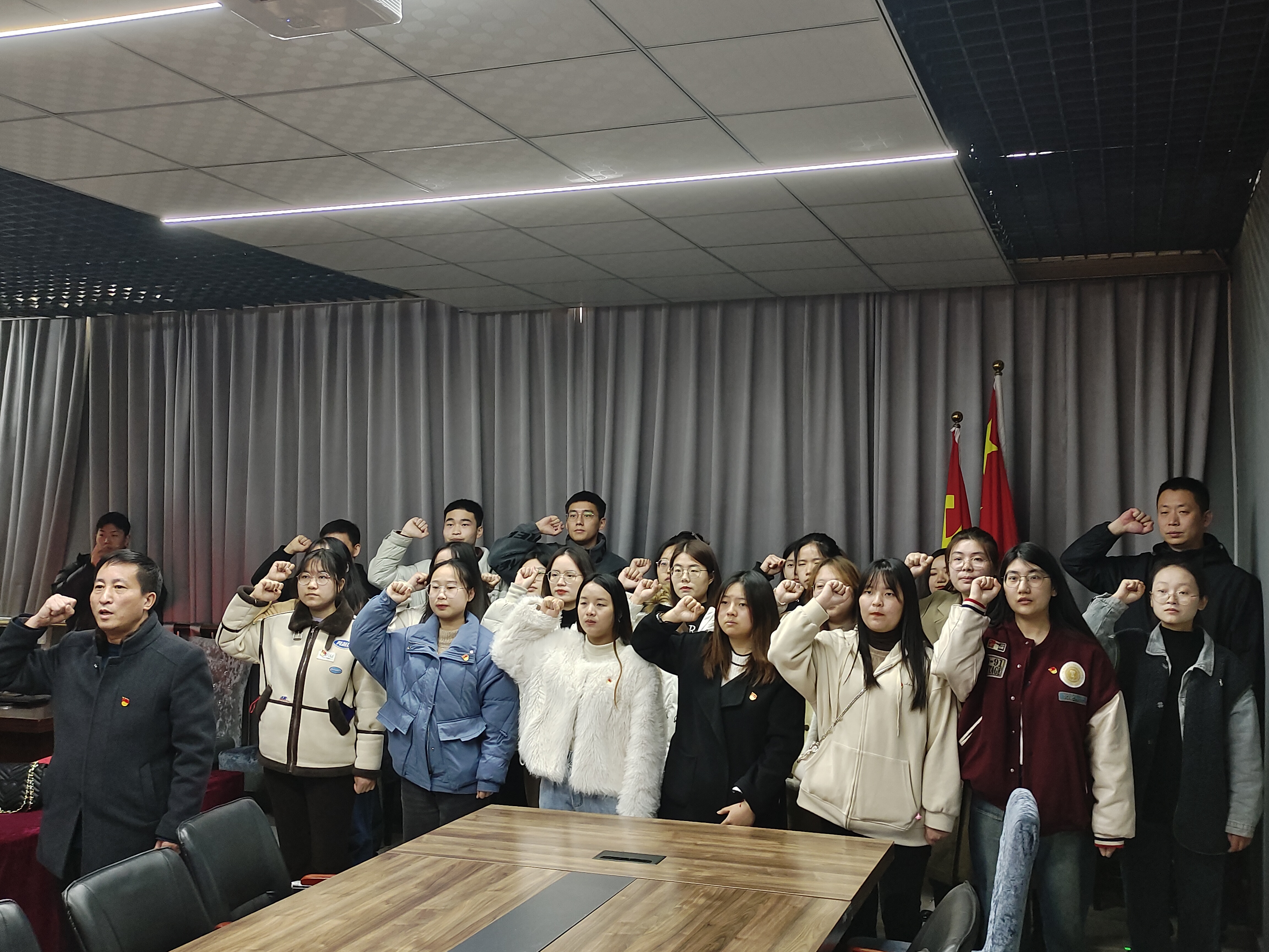随后,新党员代表葛庆怡发言,她承诺会时刻牢记对党许下的誓言,以身边的优秀党员为榜样,不断展现一个新时代党员的先进风采。入党积极分子赵文浩表示要时刻以更加饱满的热情,更加务实的作风投身到学习工作生活中,紧紧团结在党组织的周围,积极向党组织靠拢。在张建林的带领下,新党员和老党员一起高举右拳,面向鲜红的党旗,进行庄严的宣誓,许下对党忠诚,勤奋学习,努力工作,为共产主义奋斗终身的铮铮誓言。