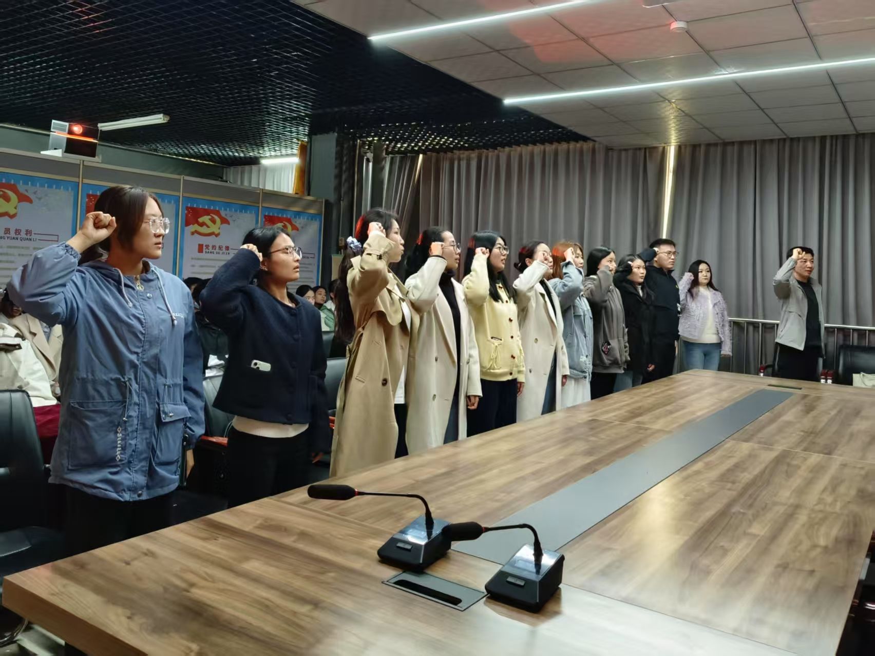 最后,在副书记孙亚南的领誓下,全体党员起立面向鲜红的党旗,举起右拳,进行庄严宣誓,党员们昂首挺胸,坚定地许下为共产主义奋斗终身的誓言。