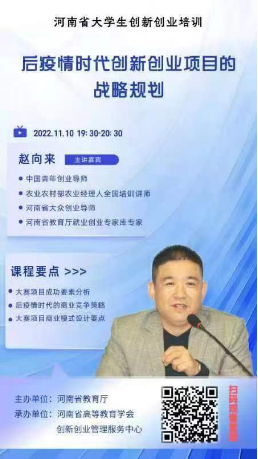 为贯彻落实《河南省进一步支持大学生创新创业的若干措施》,培养大学生自主创新意识及创业能力,进一步加强我院师生参与创新创业大赛的积极性。11月10日晚,yl23411永利集团官网登录组织师生共同观看了河南省教育厅大学生创新创业系列培训讲座第三讲,本次讲座由赵向来老师主讲。