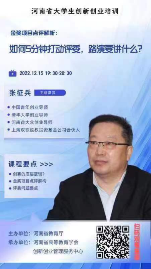 第六讲《如何5分钟打动评委,路演要讲什么》主要邀请中国青年创业导师、清华大学创业导师、河南省大众创业导师张征兵老师具体讲解了在“互联网+”大学生创新创业大赛中怎样在5分钟的时间内讲出打动评委的好路演项目,本次课程主要围绕创新创业大赛的底层逻辑、金奖项目点评结构、评委问题要点等三个课程部分展开讲解。张老师陈列了评委容易提问的十大问题,并祝愿各位同学观看完这次讲座之后都能有所收获、获得经验与启发,在接下来创赛中都能取得优异成绩,路演项目能更有新意与创新性、创造。