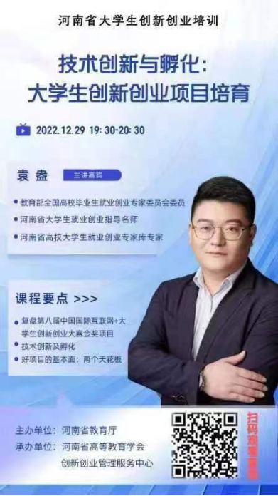 为深入推进大众创业万众创新,促进我院创新创业教育改革,加快培养创新创业人才。12月29日晚,yl23411永利集团官网登录组织师生共同观看了河南省教育厅大学生创新创业系列培训讲座第八讲,本次讲座由袁盎老师主讲。