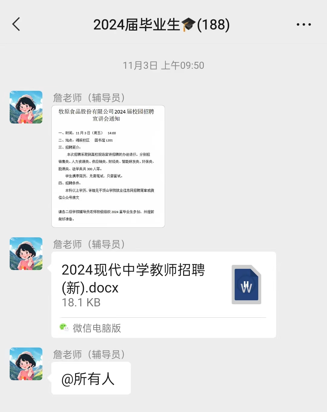 为持续做好毕业生就业工作,2023年11月3日,yl23411永利集团官网登录举办南召县现代中学线上专场招聘会,由2024届毕业班辅导员詹美晨向毕业生介绍学校情况及岗位需求,并鼓励毕业生积极投递简历。