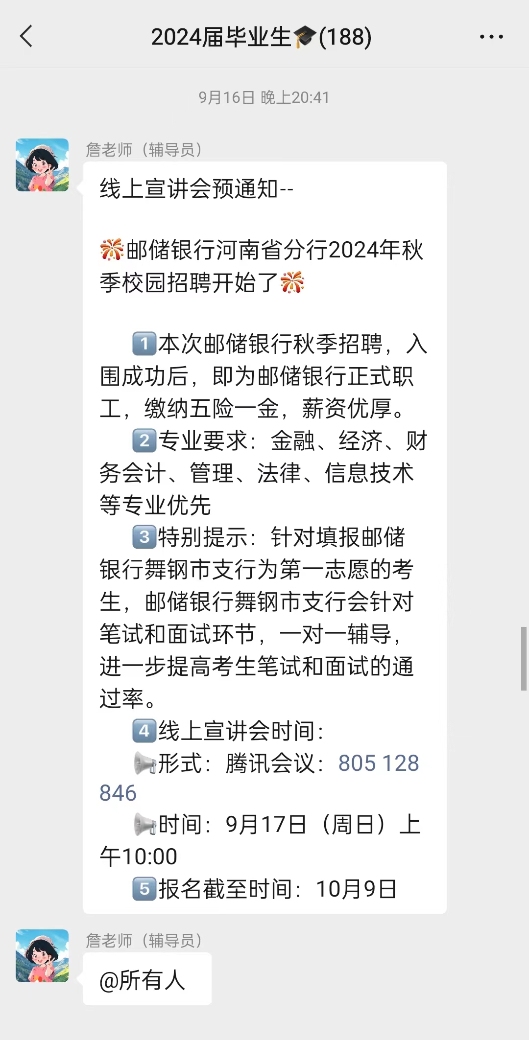 2023年9月17日上午,yl23411永利集团官网登录举办邮储银行河南省分行线上专场招聘活动,由2024届毕业班辅导员詹美晨带领金融工程专业毕业生观看网络招聘直播,并鼓励毕业生积极投递简历。