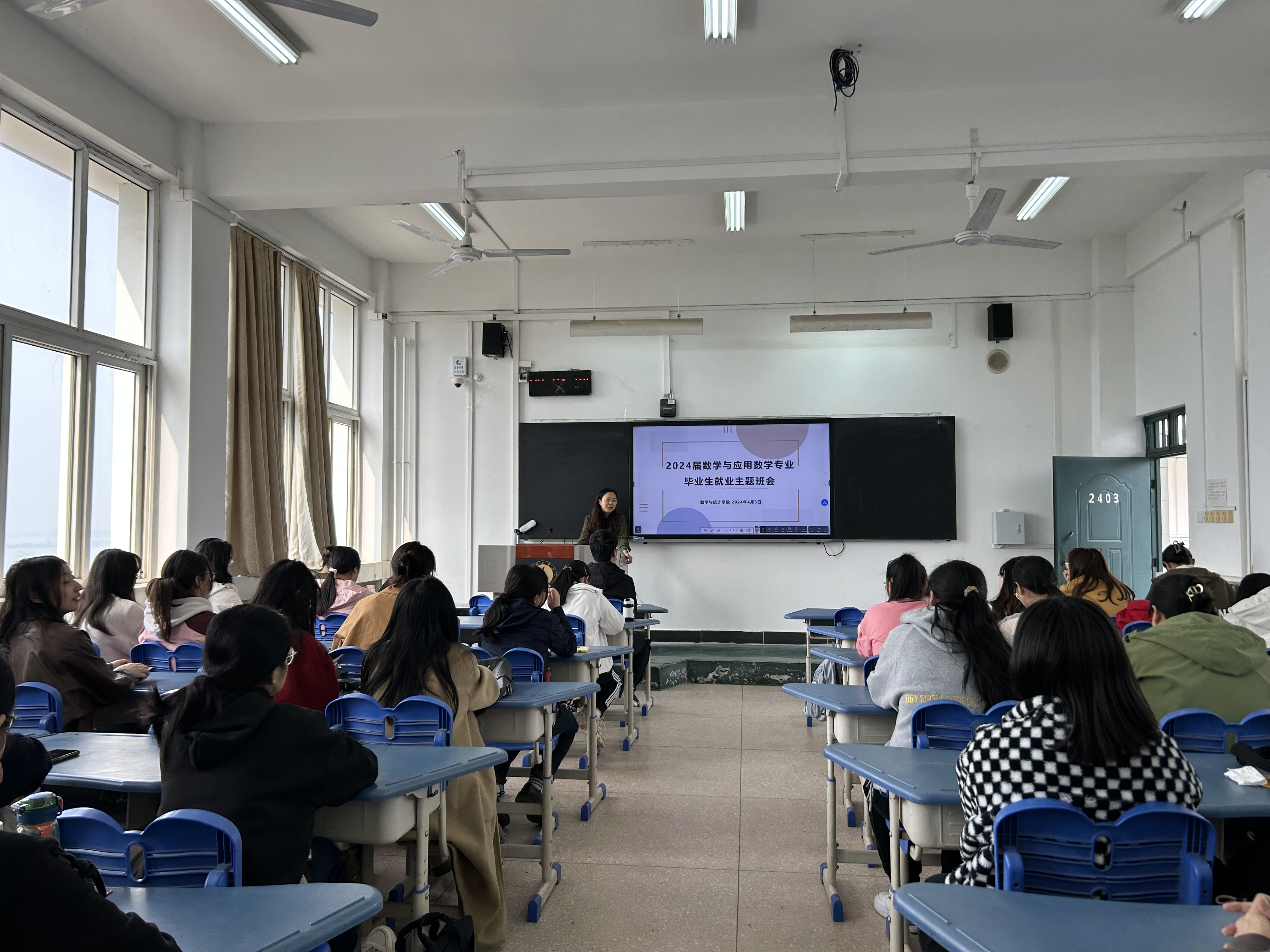 为进一步推进2024届毕业生就业工作,做好当前就业形势的分析和研判,帮助毕业生实现更高质量和更加充分就业,3月27日,学院副院长王俊俊召开数学与应用数学专业毕业生就业主题班会,会议由毕业班辅导员詹美晨主持。