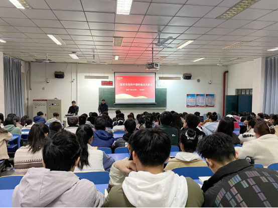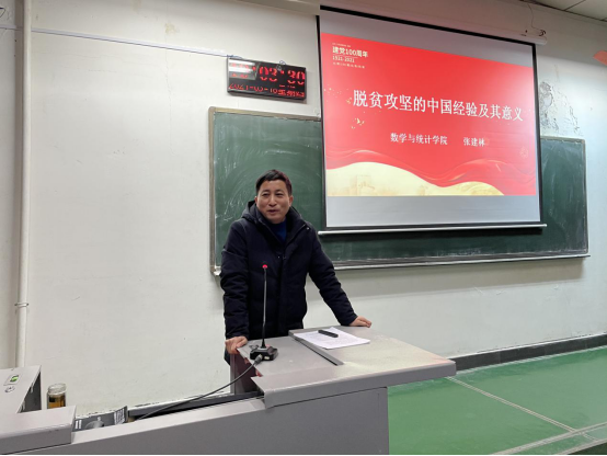 活动伊始,孙书记表示2021年中国共产党迎来百年华诞,百年风雨兼程,百年风华正茂,在建党百年这个时代坐标上,中国共产党已然创造了彪炳史册、惊天动地的成就,其中脱贫攻坚就取得了伟大胜利。接下来,张书记为大家讲授“春季开学第一课”《脱贫攻坚的中国经验及其意义》,重点从全国脱贫攻坚总结表彰大会主要精神、新时代脱贫攻坚的中国经验、新时代脱贫攻坚中国经验的重大意义三方面阐述了脱贫攻坚所取得的伟大胜利,通过举例说明东部 267 个经济发达县(市、区)结对帮扶西部 434 个贫困县胜利的情况,指出坚持发挥我国社会主义制度能够集中力量办大事的政治优势是实现全面脱贫的关键。课堂上同学们与张书记积极互动,热闹非凡,讲述自己家乡所发生的巨大变化。活动最后,张书记也嘱咐大家要从这些事迹中汲取更多的正能量,号召大家担当尽责,努力奋斗,让青春在党和人民最需要的地方绽放绚丽之花。