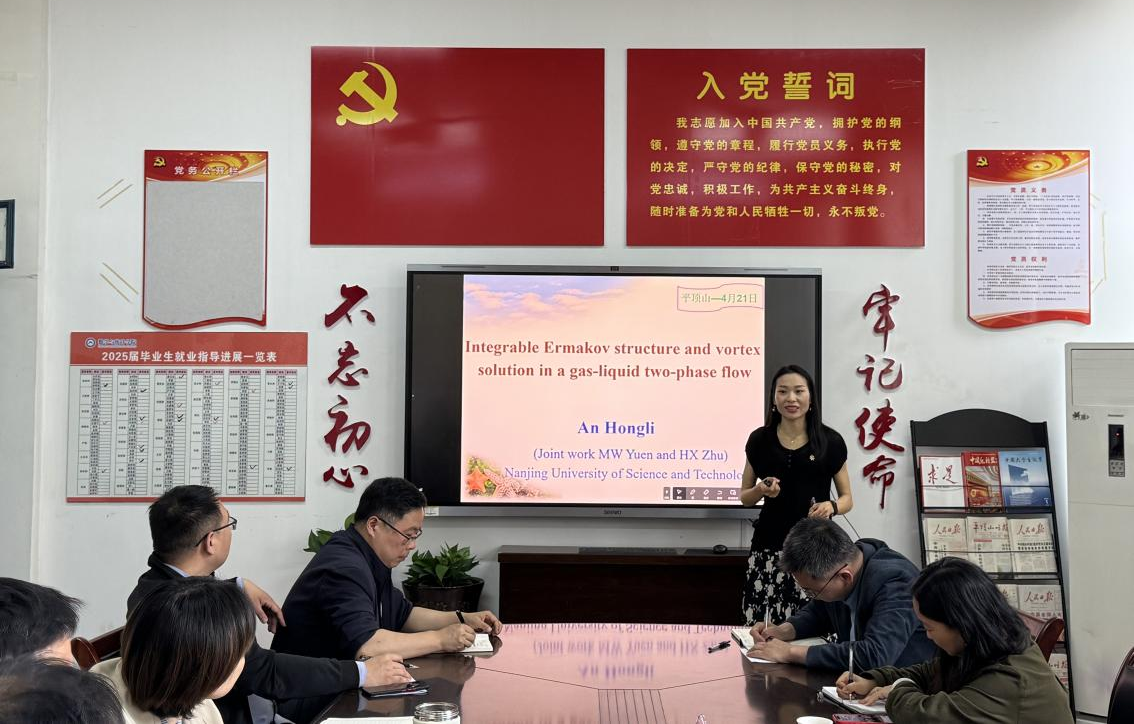 4月21日上午,南京理工大学博士生导师安红利教授在yl23411永利集团官网登录2317会议室作了一场主题为“Integrable Ermakoy structure and vortex solution in a gas-liquid two-phase flow ”的学术报告,报告由yl23411永利集团官网登录院长王俊俊主持,相关教师参加。